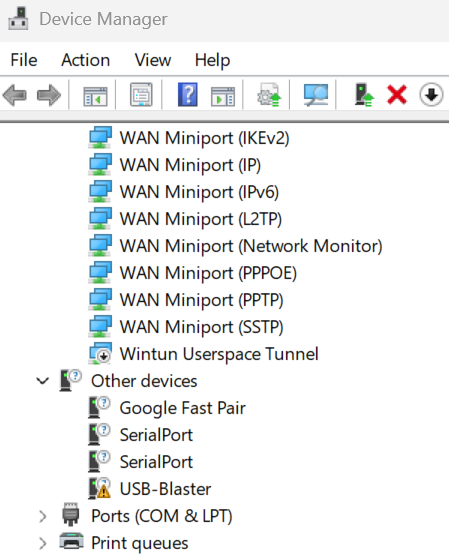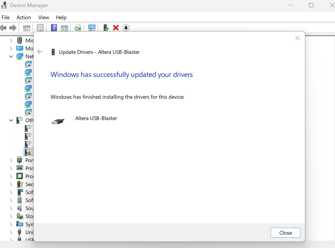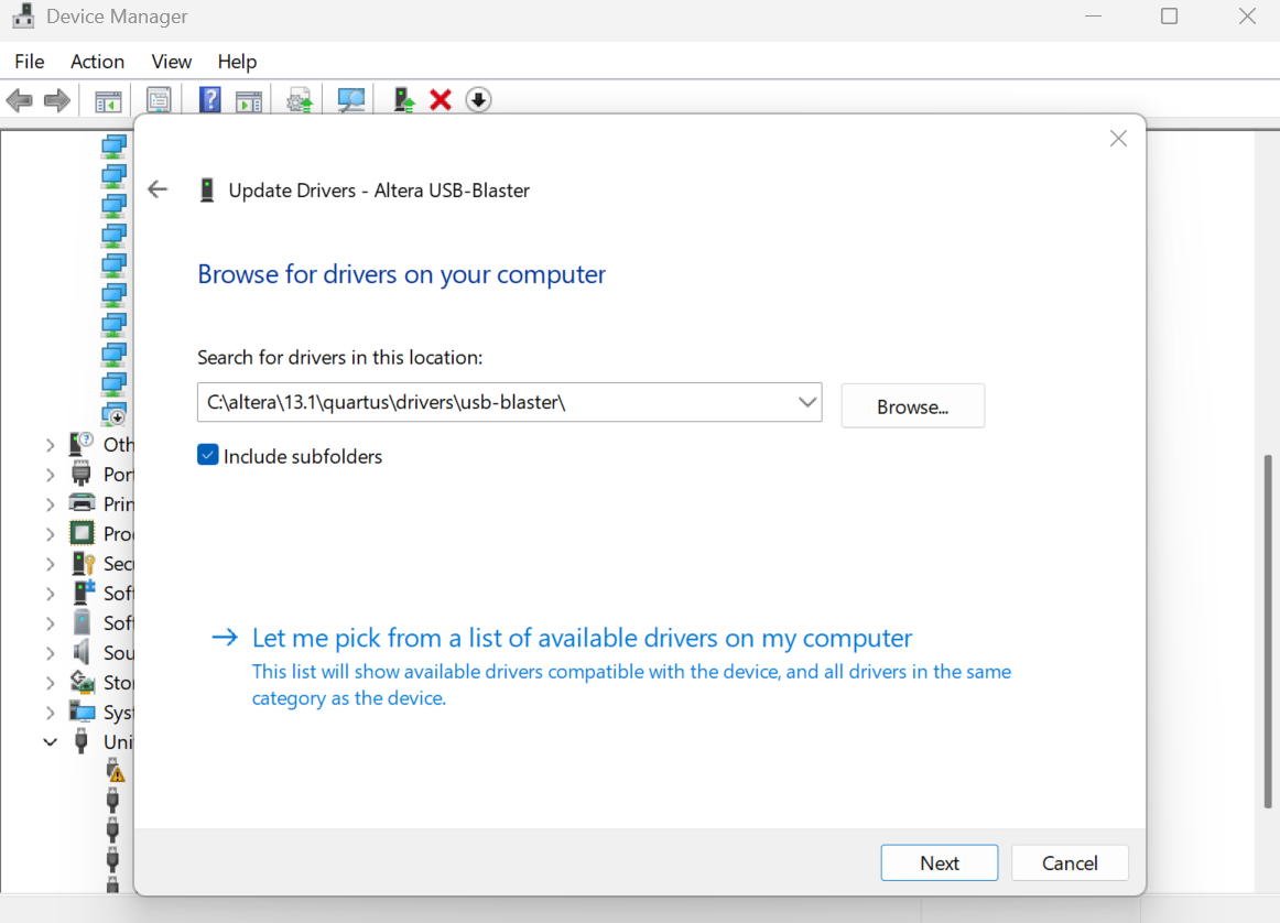 A segunda necessidade é o driver do USB Blaster para conectar o FPGA ao computador, e é neste ponto que a brincadeira começa a ficar complexa, dada a dificuldade em encontrar o driver para download e a quantidade de erros possíveis, principalmente no Windows 11. Teoricamente o driver deveria vir junto à aplicação Quartus II.