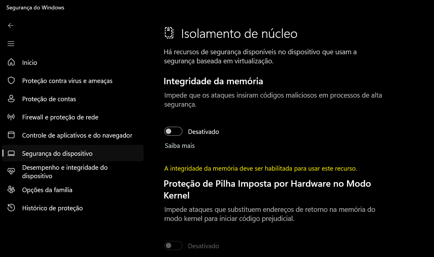 Caso a opção acima não dê resultado (e após retornar o valor do registro ao original), a segunda opção é desabilitar a integridade da memória em Segurança do Windows > Segurança do dispositivo > Isolamento de núcleo.