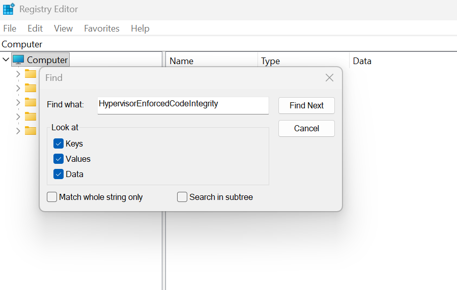 Um dos métodos é alterar o registro do Windows. Na barra de busca de seu Windows, digite regedit e procure por HypervisorEnforcedCodeIntegrity: