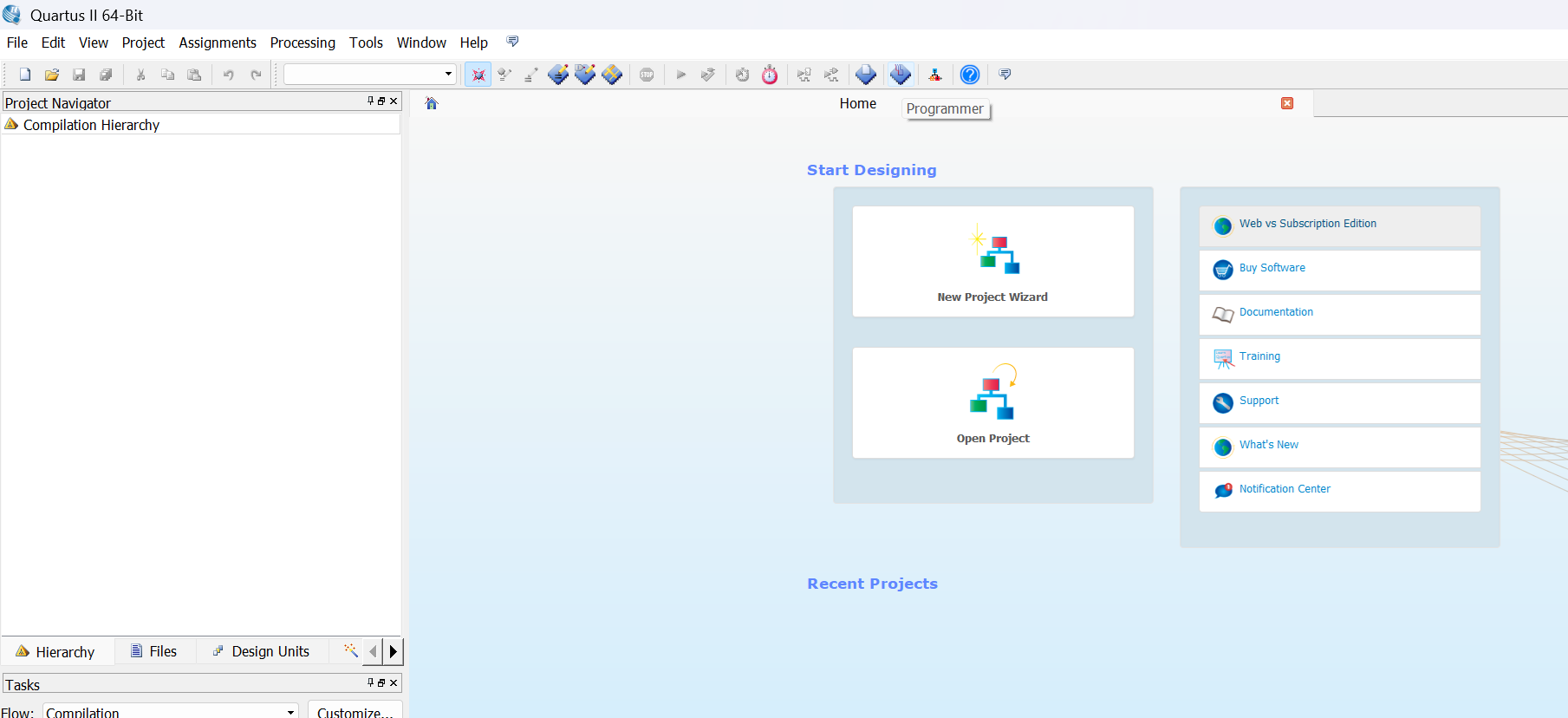 A primeira coisa da qual se precisa é a aplicação Quartus II da Altera. Após instalar a versão grátis, rapidamente você se dará conta da necessidade das instalações adicionais, então prefira perder um pouco mais de tempo e baixar a ISO completa do que ficar baixando tudo aos poucos. Vou deixar o link da ISO do Quartus II 13.1 Web Edition (grátis) para Windows aqui, mas caso se encontre desatualizada, segue de qualquer forma o link do download na Intel.