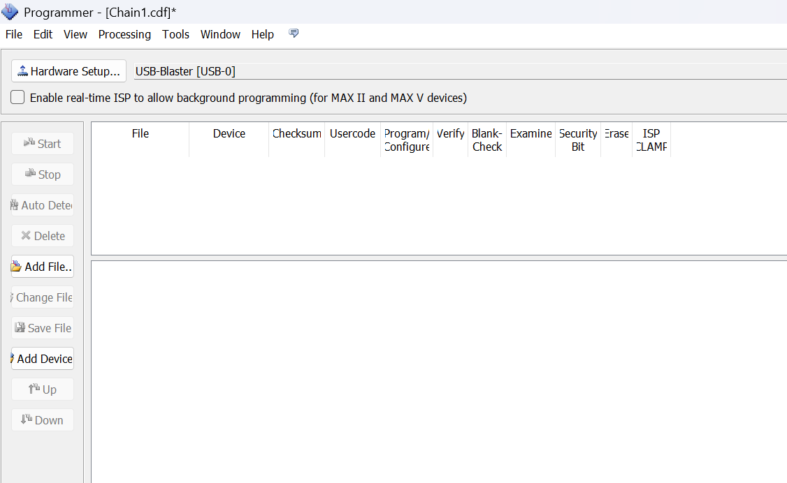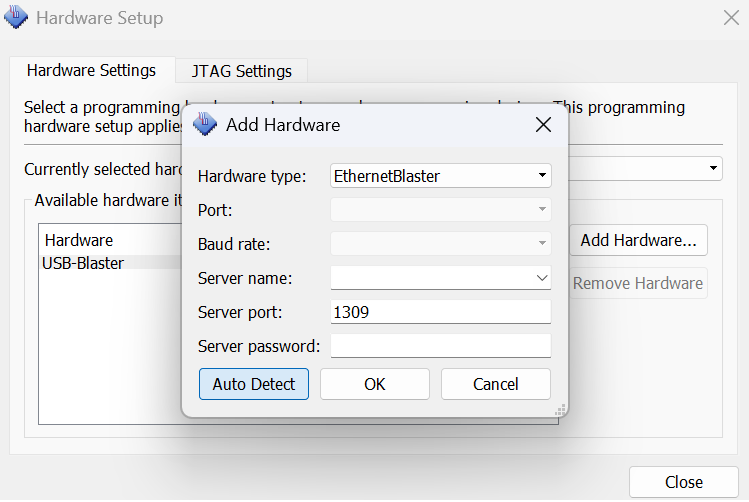 Se a USB Blaster aparecer disponível, vá para a instalação do firmware, caso contrário, clique em Hardware Setup > Add Hardware com a USB Blaster selecionada. Clique em Auto Detect e, se estiver tudo conforme a imagem abaixo, em Ok.