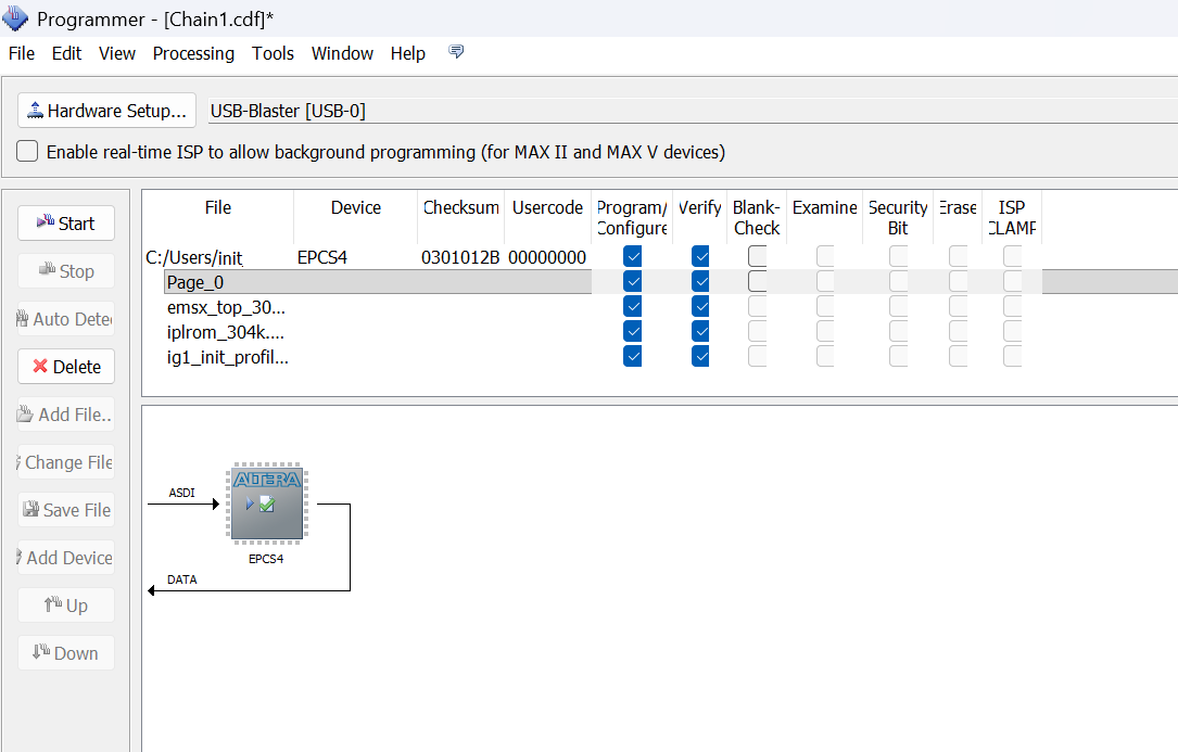 O que você precisará agora é de um firmware compatível. Recomendo o firmware do MSX2+ do OneChipMSX disponível aqui. Procure pelo OCM Pack em sua última versão. Extraia o conteúdo compactado e abra o software Quartus II com a USB Blaster conectada na USB.